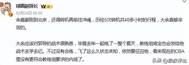 余嘉豪:很荣幸能代表中国男篮参加比赛,然后肯定有很多困难,但这些都不是借口,作为一个职业运动员在场上要尽量展示自己最好的状态,能帮助球队是我应该做的,很多客观的因素,就是要靠自己去克服。